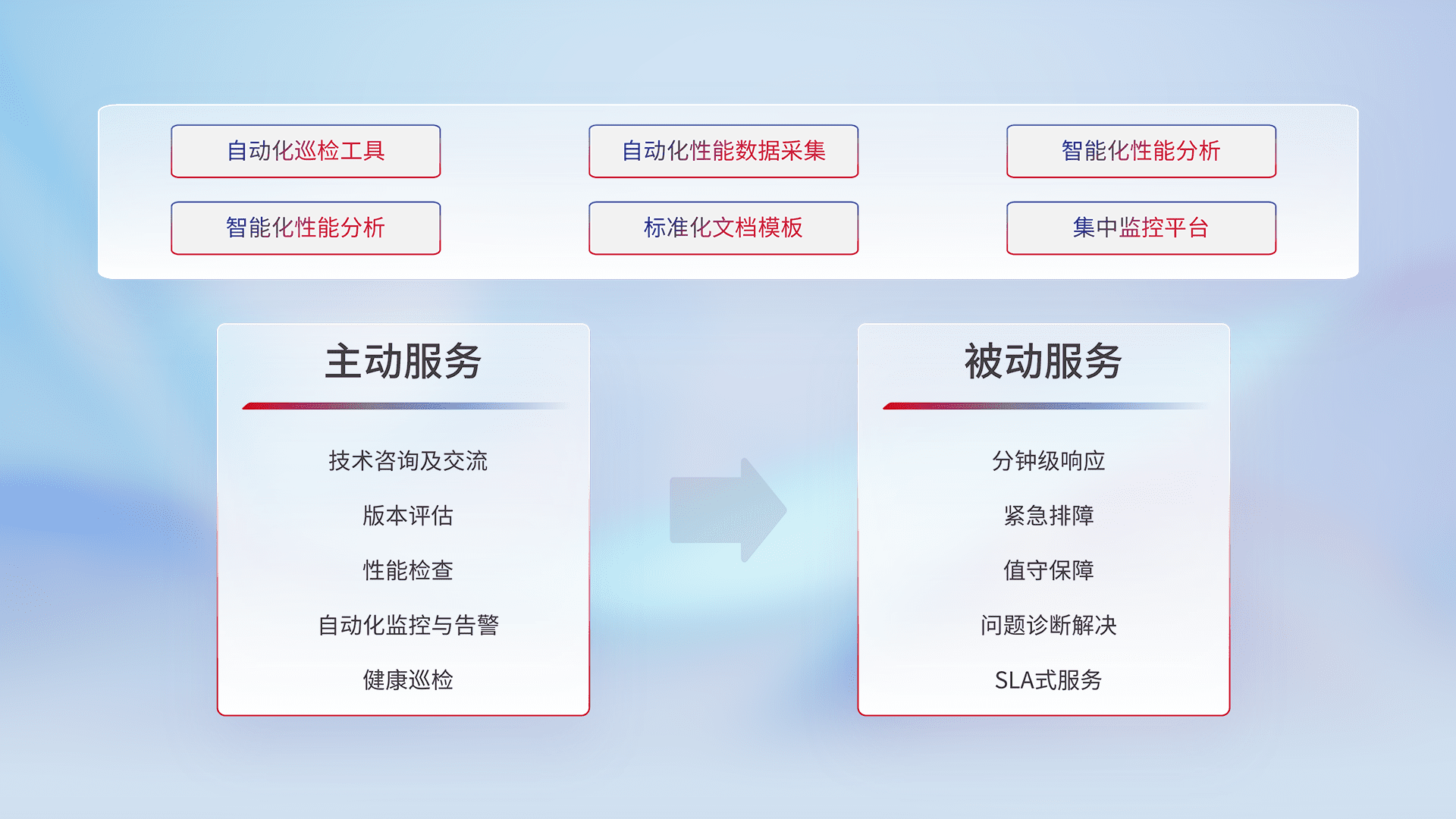 智能化工具和标准化文档,,,保障服务质量,,,提供主动服务(包含技术咨询、、、版本评估、、、、性能检查、、、自动化监控与告警、、、、健康巡检)和被动服务包含(分钟级响应、、、、紧急排障、、值守保障、、问题诊断解决、、、SLA服务)。。